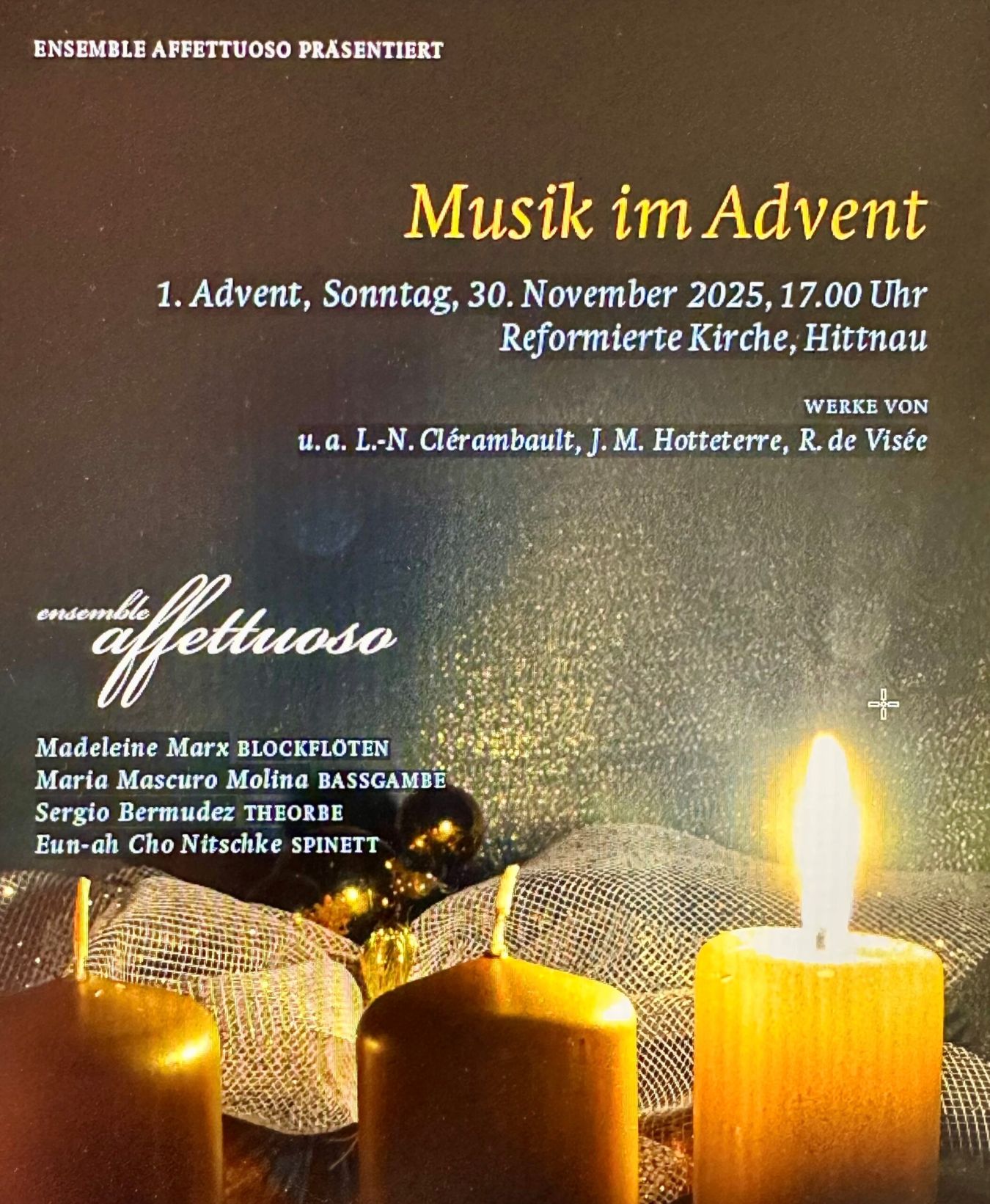 Wir können allen Freudinnen und Freunden von Parasolka den Besuch des Adventskonzertes wärmstens empfehlen. Gespielt werden unter anderem WERKE von L.-N. Clérambault, J. M. Hotteterre, R. de Visée. Als Musiker:innen treten auf: Madeleine Marx BLOCKFLÖTEN, Maria Mascuro Molina BASSGAMBE, Sergio Bermudez THEORBE, Eun-ah Cho Nitschke SPINETT. Danke liebes «ensemble affettuoso» und einen tollen Auftritt!